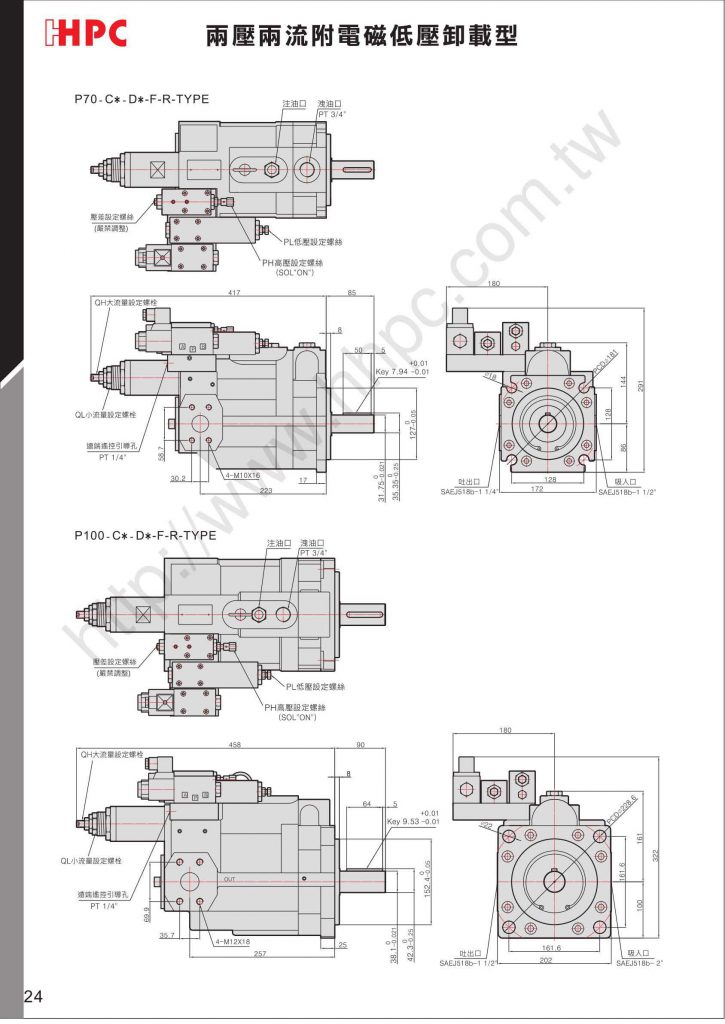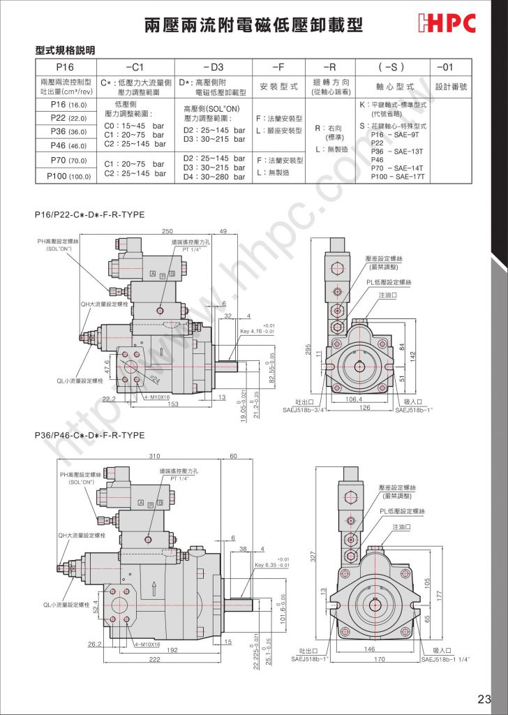 P16-C1-D3-F-R-01 C-D_Type产品特色说明 两压两流的控制功能,系统压力超过PL的压力设定值以上时,泵浦自动转变为QL值的小流量。 高压测PH的压力是由泵浦上安装的电磁方向阀的换向,来转变低压卸载或是高压力的型式使用。