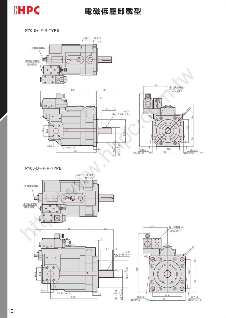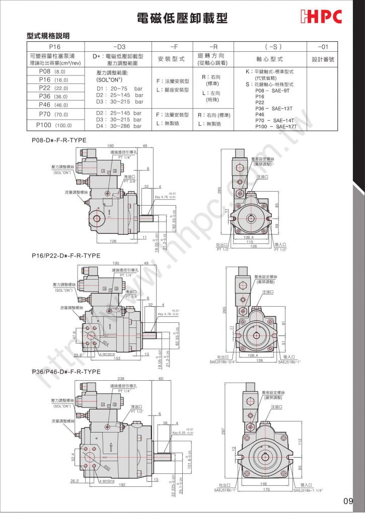 P16-D3-F-R-01电磁低压卸载型 D_Type产品特色说明 当通过泵浦上安装的电磁方向阀的换向,可做低压卸载的功能和切换成压力控制的功能形式使用。 适合於系统压待机较长的情况,搭配此功能可减少能源的浪费。