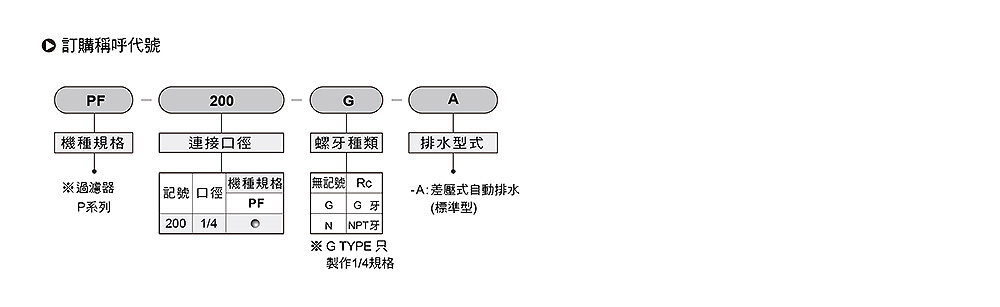 使用流体:空气,配管口径尺寸:Rc 1/4,过滤精度:5um,最大使用压力:9.5 kg/cm2,使用压力范围:0.5~8.5 kg/cm2,周围温度:5~60℃ 。