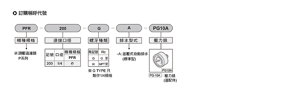 使用流体:空气,配管口径尺寸:Rc 1/4,过滤精度:5 um,最大使用压力:9.5 kg/cm2,使用压力范围:0.5~8.5 kg/cm2,周围温度:5~60℃ 。