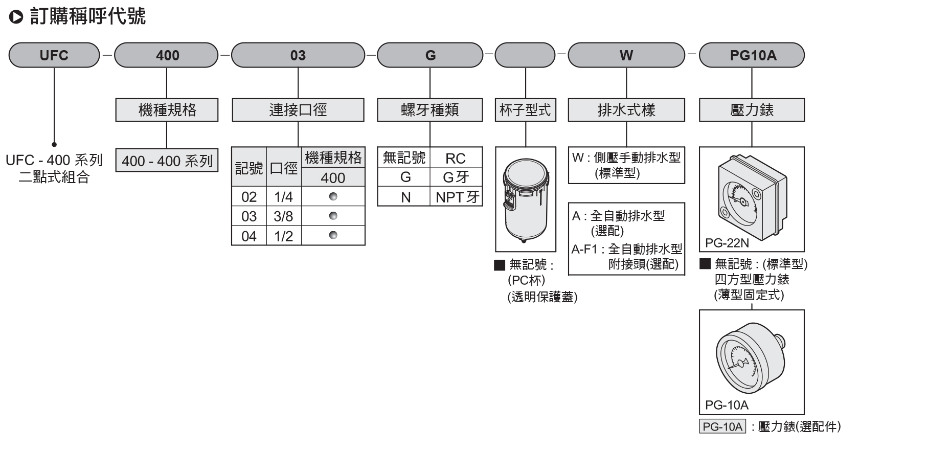 使用流体 空气,配管口径尺寸 Rc 1/4、Rc 3/8、Rc 1/2,过滤精度 5 um,最大使用压力 10 kg/cm2,使用压力范围 0.5~8.5 kg/cm2,周围温度 5~60℃。