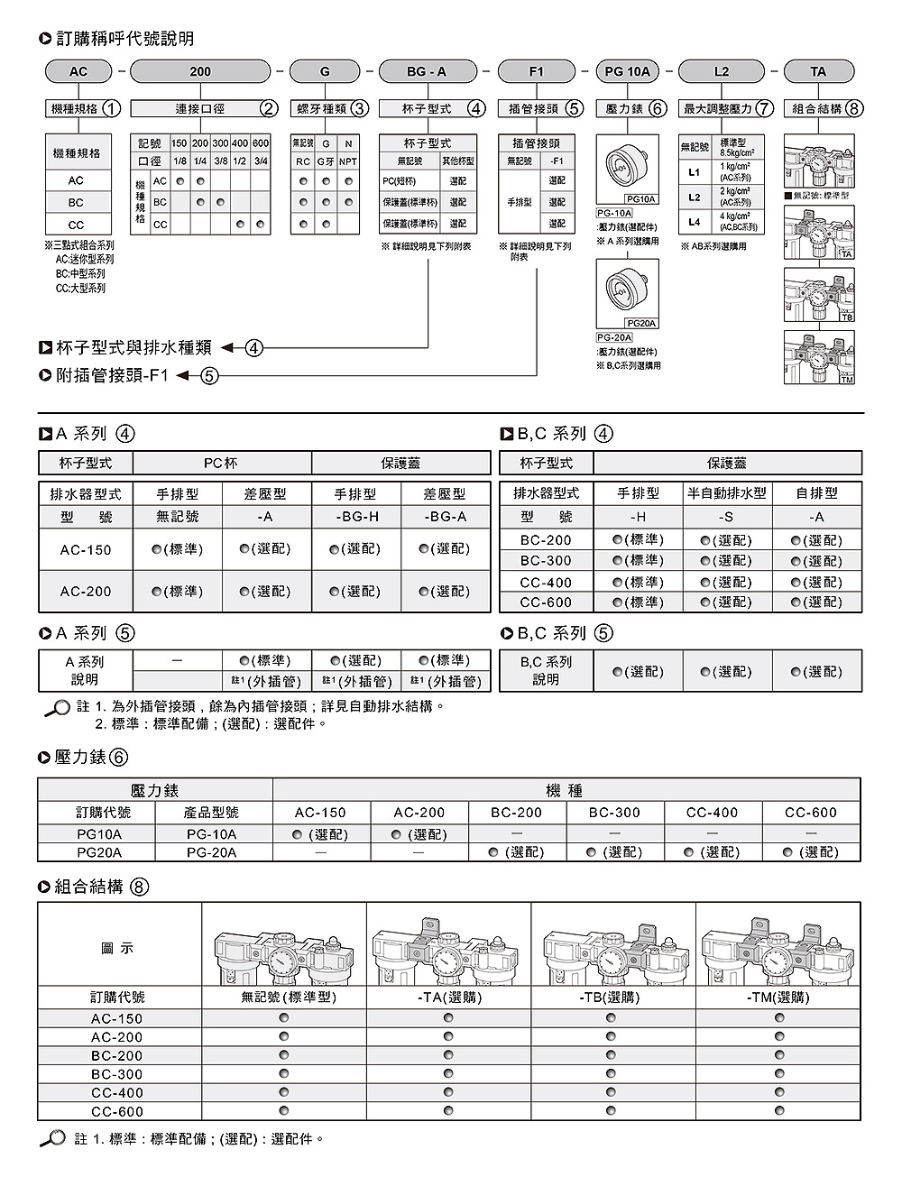 使用流体:空气,配管口径尺寸 M5 ~ RC 1,过滤精度 5 um,最大使用压力 9.5 kg/cm2,使用压力范围 0.5~8.5 kg/cm2,周围温度 5~60℃。